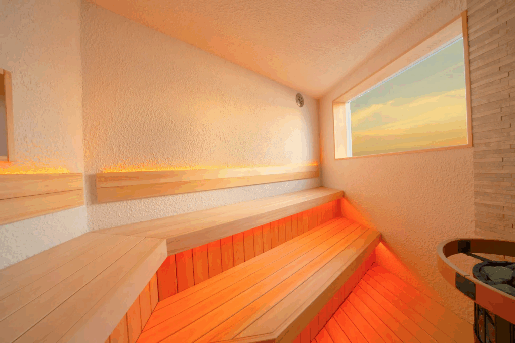 ノルウェーはオスロにある『SALT』から着想を得た、瀬戸内海の絶景と日光を浴びながらのサウナ浴が楽しめるオーシャンビューサウナ。「瀬戸内のこの場所ならではの景色」として、『日本の夕陽百選』に選ばれた有明浜沖に浮かぶ伊吹島が切り取られていて、日中とは大きく雰囲気の変わる、夜間の幻想的なライトアップも魅力的。